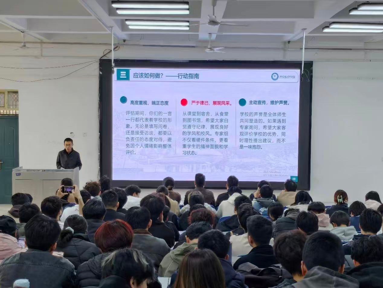 孙书记从“是什么、为什么,怎么做”三个角度详细讲述了此次审核评估对学校发展与学生培养的重要意义,特别强调了与会同学应在审核评估期间起到模范带头作用,以高度的责任感和使命感,营造优良学风校风、展现西航学子良好的精神风貌。