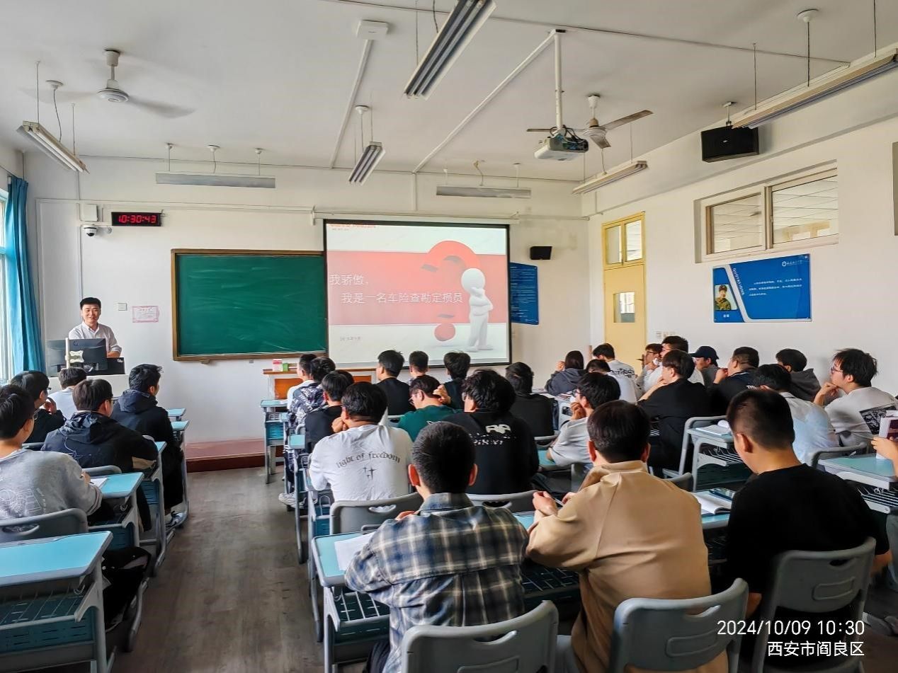 我院专任教师吴玲与中国平安财产保险股份有限公司陕西分公司合作申请的《汽车保险与理赔》课程获我校教务处2024年校企合作课程建设项目立项,该课程为汽车服务工程专业核心课,本次授课对象为2021级本科生。根据授课安排,自10月9日起,中国平安财产保险股份有限公司陕西分公司的工程师团队正式入驻课堂,计划进行5次授课,并派遣了9位资深的理赔工程师参与教学。