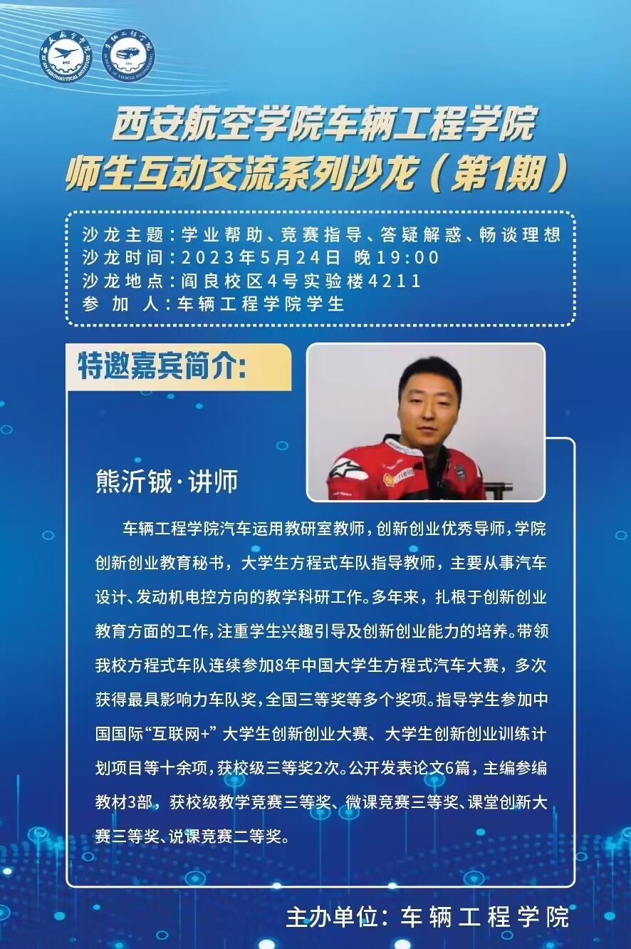 5月24日,车辆工程学院打造的系列沙龙第一期,在阎良校区车辆工程学院会议室召开,主讲嘉宾熊沂铖老师与二十多位来自于不同年级不同专业的学生畅谈理想,畅想大学生活。此次活动旨在让同学们在轻松愉快的氛围中相互交流,互相探讨,共同探讨自己的理想。