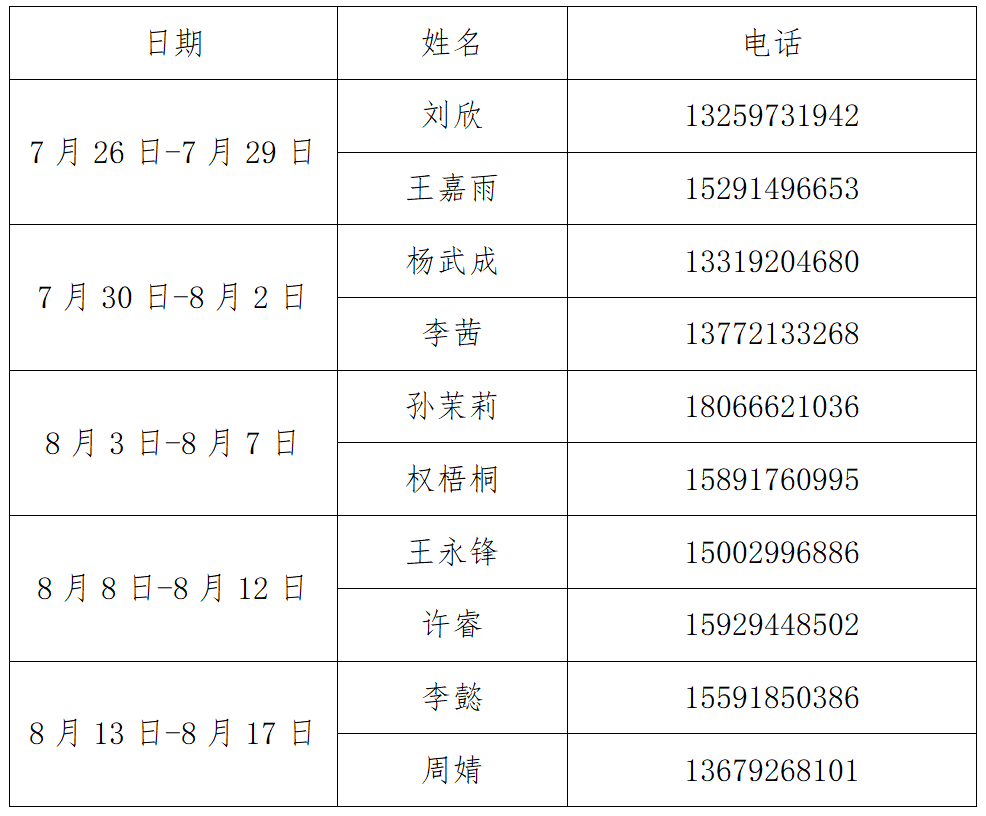 根据学校《关于2025年暑期放假安排的通知》文件精神,教职工放假时间为7月26日至8月17日,放假期间,15vip太阳集团值班安排如下: