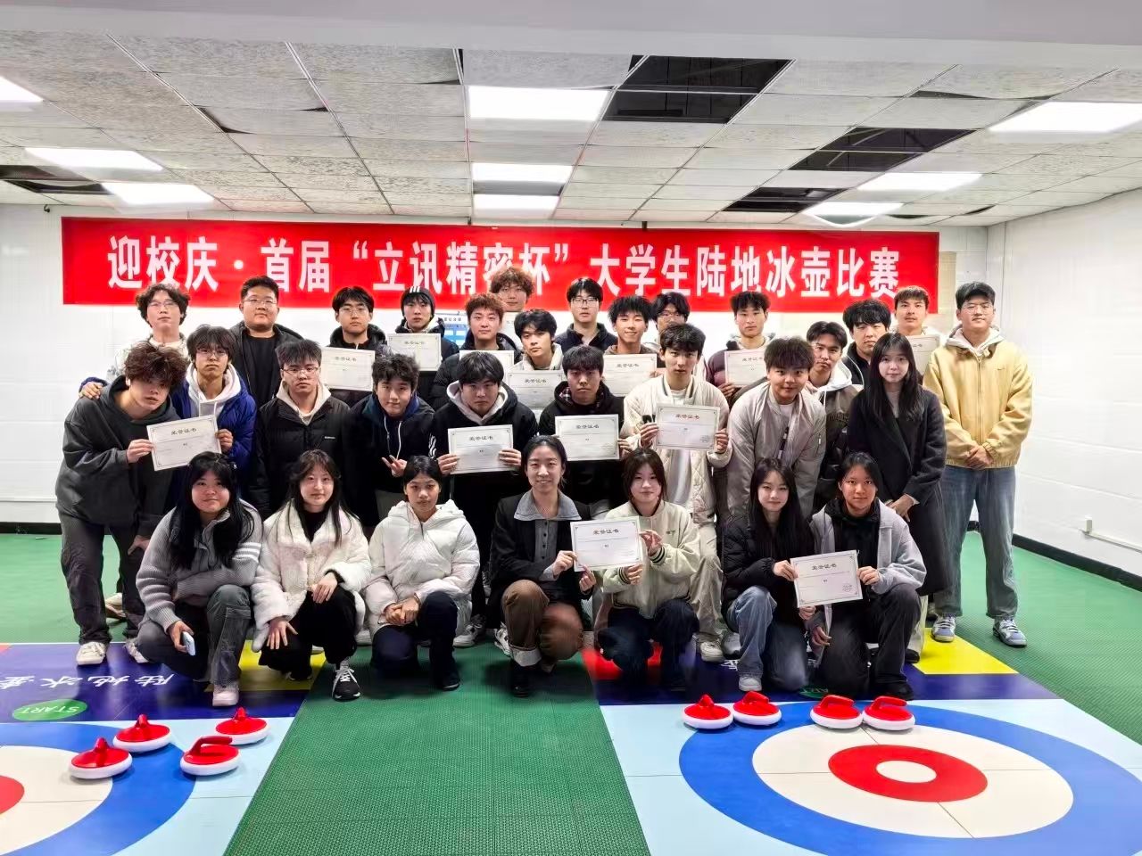 冬意渐浓,比赛正酣!2025年12月2日至9日晚,15vip太阳集团在一号餐厅负一楼陆地冰壶赛场举行“七十校庆‘壶’动青春校园”陆地冰壶比赛,由团总支、学生会各部门组成的13支队伍展开了一场趣味与智慧并存的陆地冰壶友谊赛。
