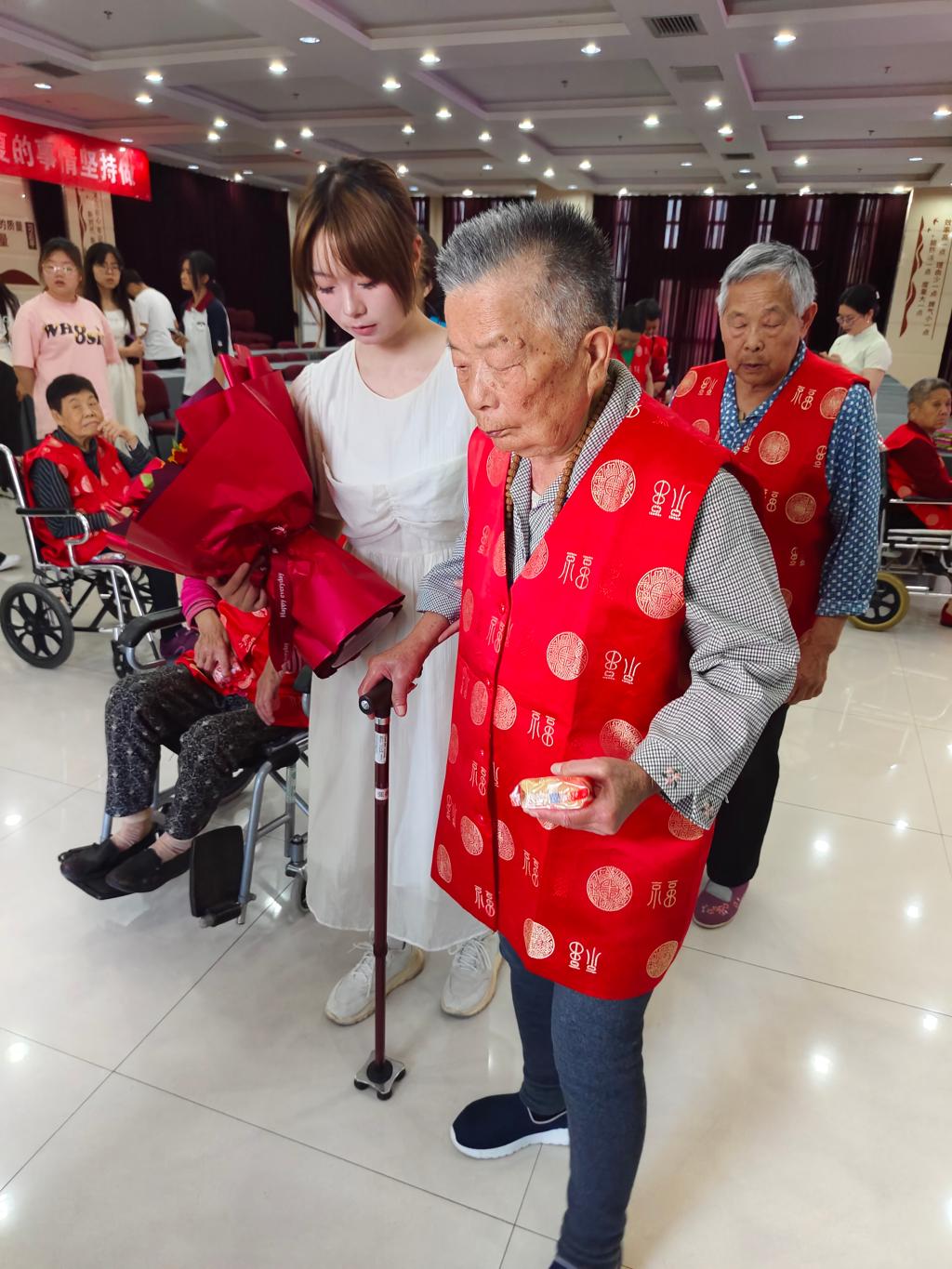 党员志愿者中队联合学院文艺部精心准备了丰富多彩的文艺演出,为老人们带去欢乐和笑声。歌曲《童年》、朗诵《母亲是一种岁月》、手语操《相信明天会更好》、歌曲《萱草花》,赢得了全场观众的掌声,老人们个个脸上洋溢着幸福的笑容。表演结束后,志愿者和工作人员将精心准备鲜花、小礼品一一送到老人手中。