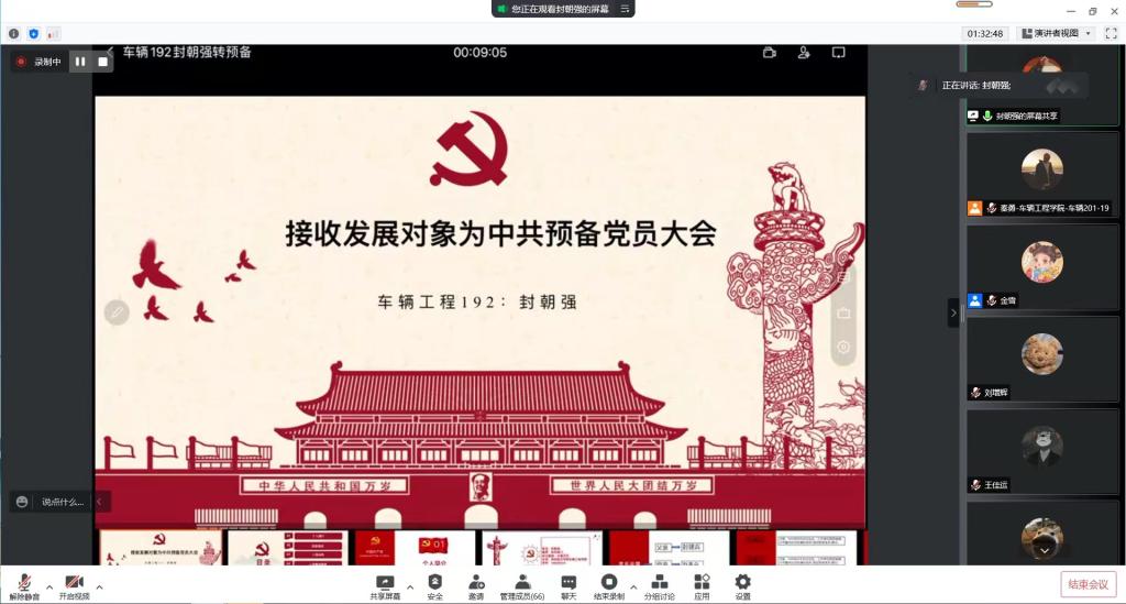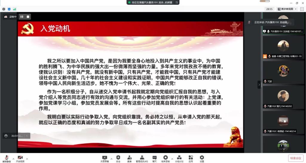 最后,支部书记做了总结讲话,向预备党员们表示祝贺并提出希望与建议。期望学生党员们进一步提高政治素质,向身边优秀党员学习,严格按照党员的标准来要求自己,履行党员应尽的义务,将理论与实践相结合,争取早日成为一名正式的共产党员。(文/车辆工程学院 金雪 图/车辆工程学院 秦勇)
